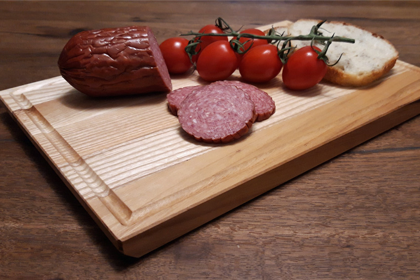 Das Jausenbrett ist extra groß und bietet daher genügend Platz für eine anständige Jause, es ist mit einer Saftrille versehen und an den Seiten abgeschrägt damit man es besser heben kann. Angefertigt wurde das Jausenbrett vom Steiner der Schreiner persönlich.
