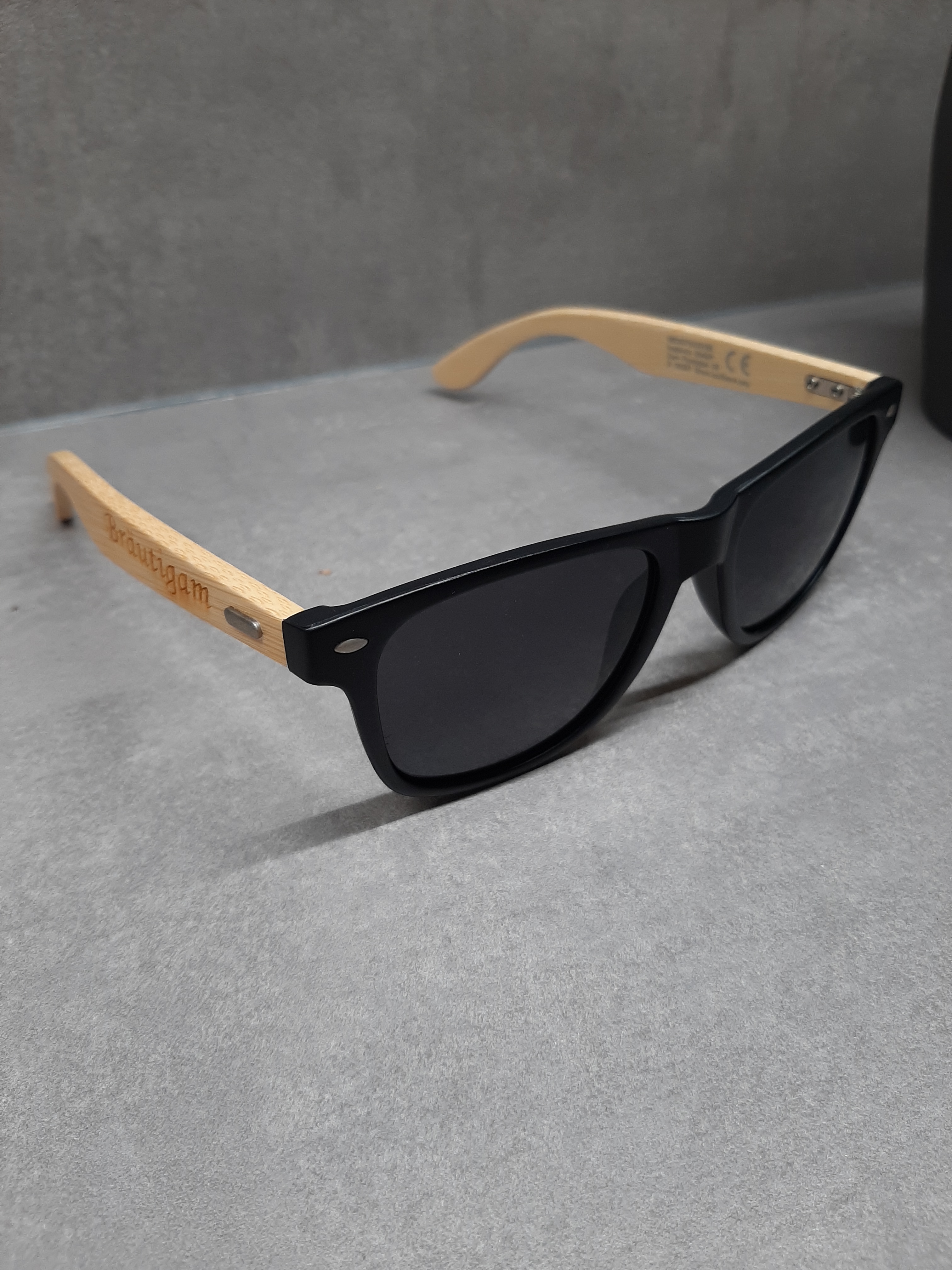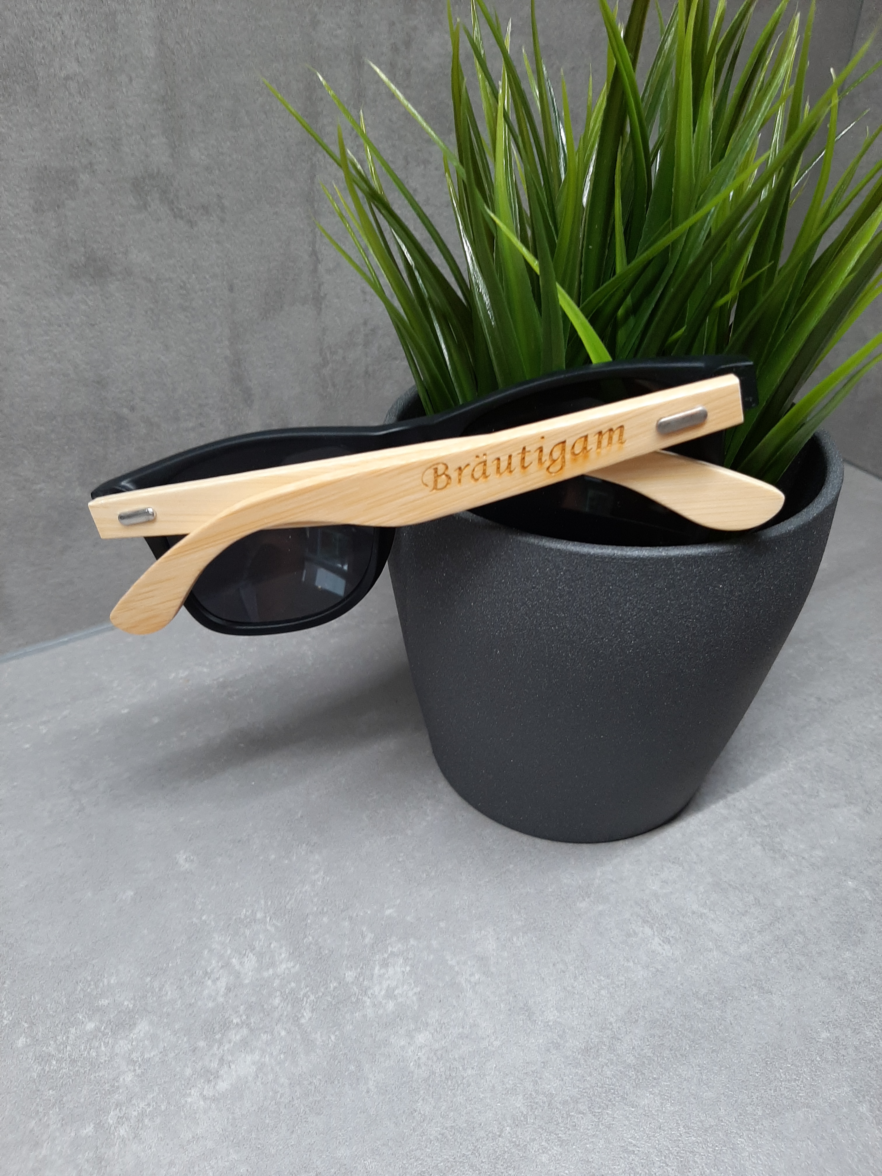 Die coole Sonnenbrille, ist perfekt geeignet für den Bräutigam an einem sonnigen Hochzeitstag oder als Geschenk für die Trauzeugen oder andere Gäste. Die Sonnenbrille kann auf einem oder beiden Bügeln graviert werden. Bis zu 15 Zeichen sind inklusive, weitere Zeichen sind gegen Aufpreis möglich.