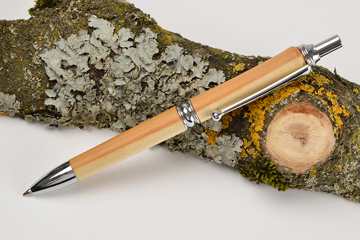 Sie werden aus einem Stück Holz gedrechselt und sind mit einer hochwertigen Mine ausgestattet.Am Foto: Schreiberart: Klick-Kugelschreiber Farbe: Chrom Holzart: EibeStell dir deinen Wunschschreiber zusammen und wähle aus unterschiedlichen Farben und Holzarten. Jeder Schreiber wird individuell für dich angefertigt.